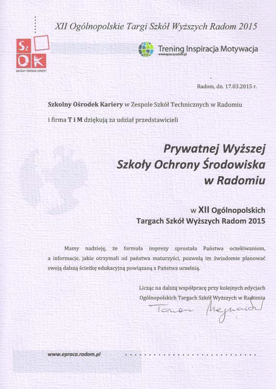 XII Ogólnopolskie Targi Szkół Wyższych Miło nam poinformować, nasz Uczelnia uczestniczyła w XII Ogólnopolskich Targach Szkół Wyższych, które odbyły się 17 marca 2015 roku w Radomiu. Serdecznie dziękujemy za zainteresowanie ofertą edukacyjną oraz odwiedzenie stoiska naszej Uczelni. |